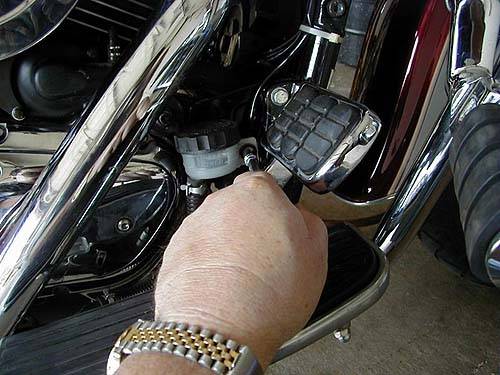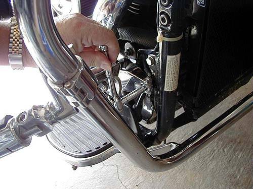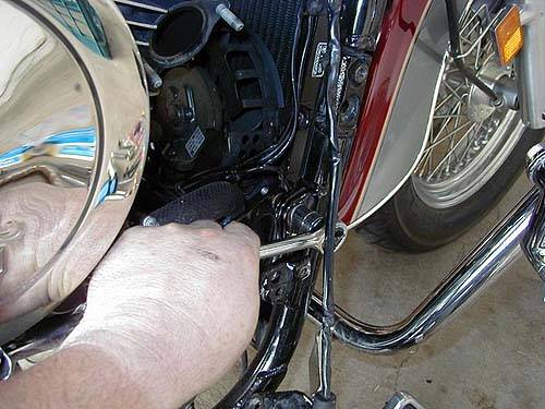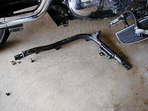 Mit einem 14mm Schlüssel entfernen Sie die beiden Schrauben, die den rechten Unterzug am Rahmen befestigen. Der hintere Bremslichtschalter muß entfernt werden, damit