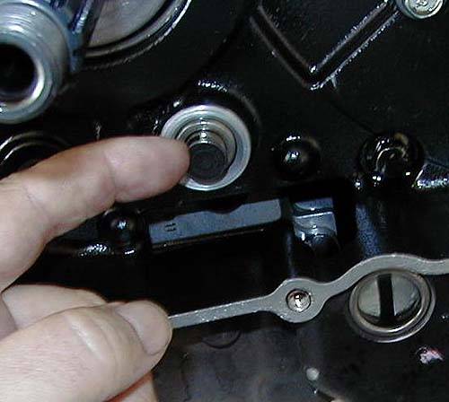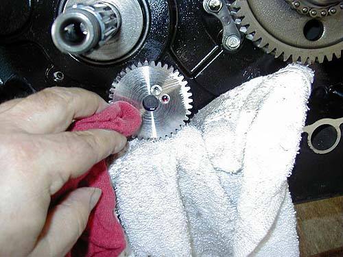 Stecken Sie nun einen Lappen in die Bohrungen unter dem Ölpumpen Zahnrad, damit keine Rückstände oder Teile in den Motorblock fallen.
