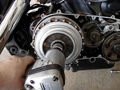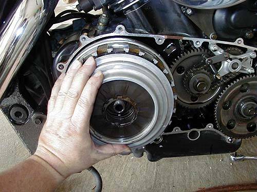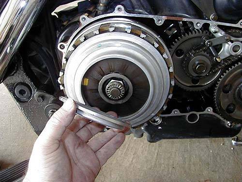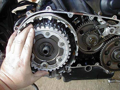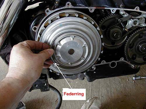 Man kann nun den gesamten Kupplungskorb entfernen, ohne alle Teile zu zerlegen. Einfach hinter den Kupplungskorb greifen und die gesamte Einheit abziehen.