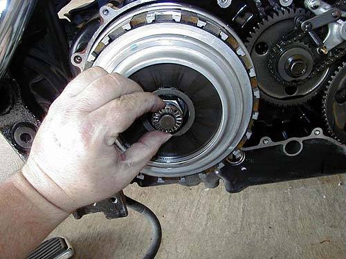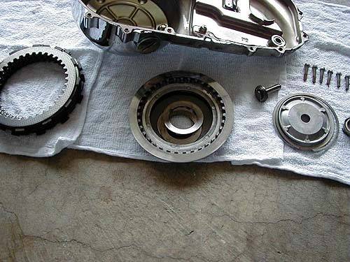 Sie können die äußere Nabe (Abbildung) jetzt entfernen. Nachdem die äußere Nabe entfernt ist, können Sie Ihre Finger hinter den Rest des Kupplungkorbes legen und