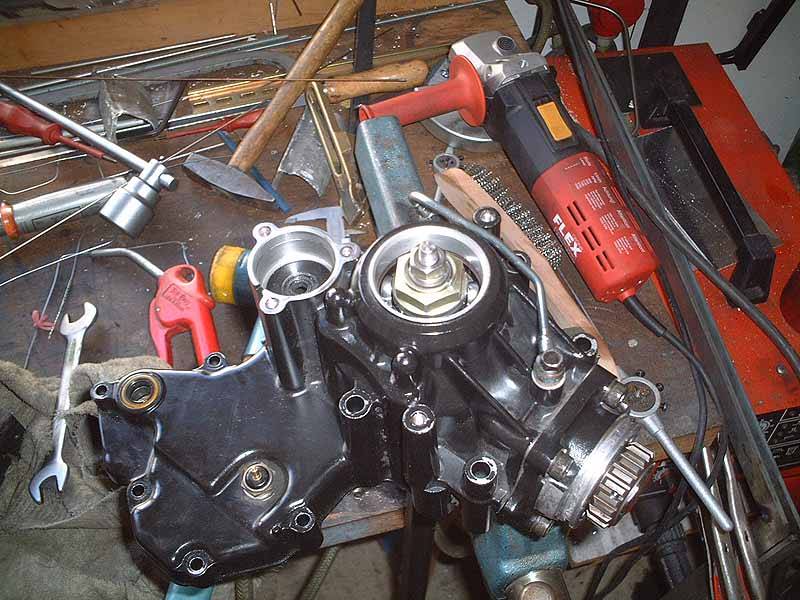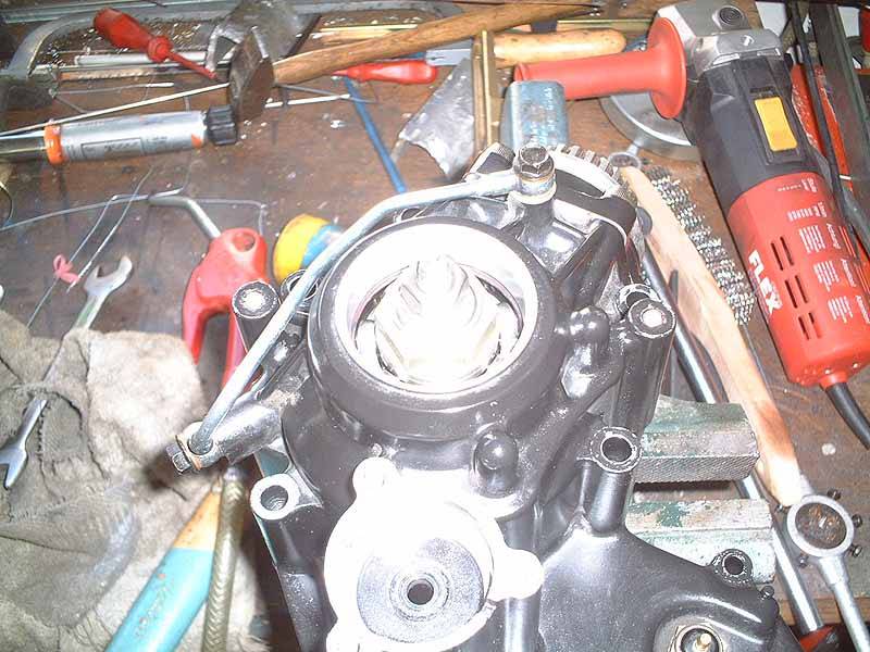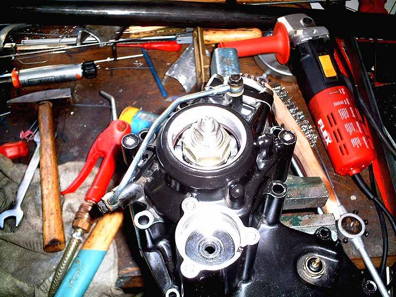 Der Motor muß entweder raus, oder an der hinteren Aufhängung gelöst und nach oben gegen den Rahmen