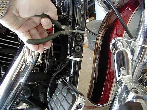 Mit einem Seitenschneider werden die Kabelbinder durchtrennt, welche die Kabel am Rahmenunterzug halten. Unter Umständen muß ein installierter Sturzbügel entfernt