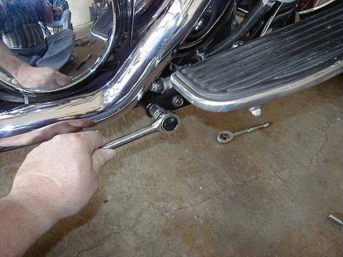 Mit einem 14mm Schlüssel entfernen Sie die beiden Schrauben, die den rechten Unterzug am Rahmen befestigen. Der hintere Bremslichtschalter muß entfernt werden, damit